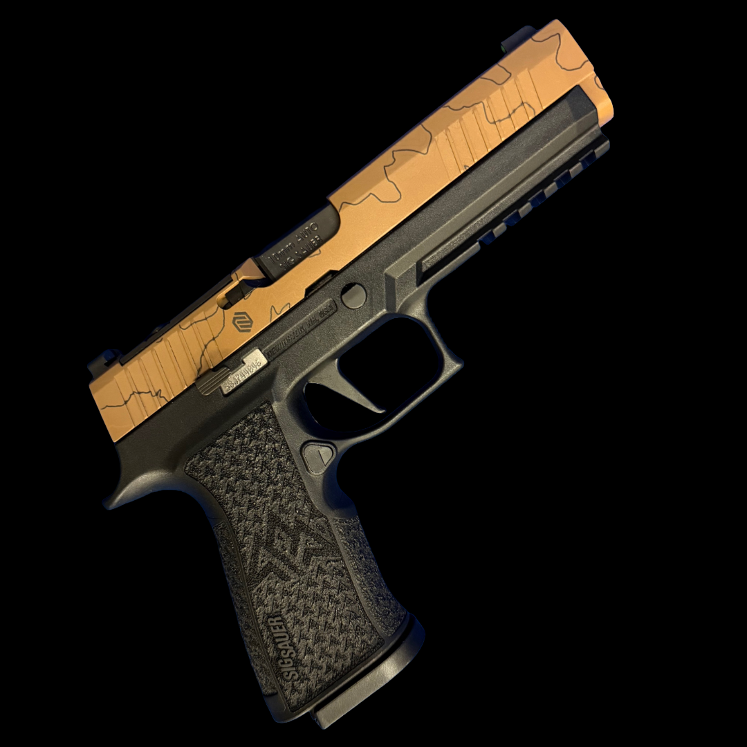 The P320-XTEN ENDURE features a fully Cerakoted slide for extreme protection against the elements, with a Custom Works exclusive laser-etched topographic pattern. The P320-XTEN ENDURE also features a 5” bull barrel for maximum accuracy. The slide is optics-ready with a PRO footprint and it comes standard with X-RAY3 Day/Night Sights.